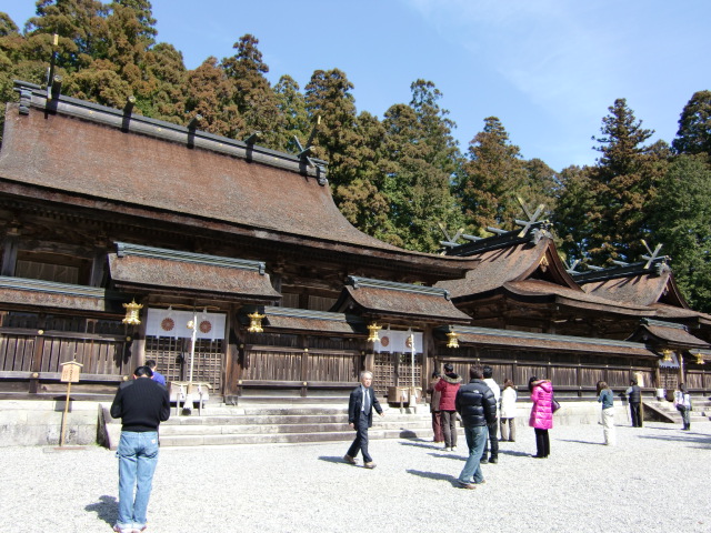 麓の道路標識にもちゃんと「世界遺産熊野大社」って書いてあります(笑) 参道の階段は上りと下りで通る場所が分かれてて、どっちも左側を通る、んだったかな?曖昧。粛然としてて神秘的な雰囲気に包まれてます。ここは珍しく朱塗りでない社。一番右端の神殿には天照大神が祀られてます。皆さん無言で随分厳かな雰囲気の中参拝してました。カメラ構えてる人もいない。つい隅っこの方から撮影しちゃったけど、ホントは撮影禁止の場所だった・・・。ごめんなさい・・・