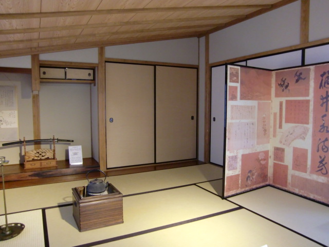 再現暗殺部屋は刀の置き方が特徴的だった。右向きに置いてるんだよね。正式には左に向けて置くものなんだけど、もしもの時のためにすぐ抜けるように。個人的に屏風が気に入ったからポストカードで購入しました。あと海援隊の規約書いたやつとか。